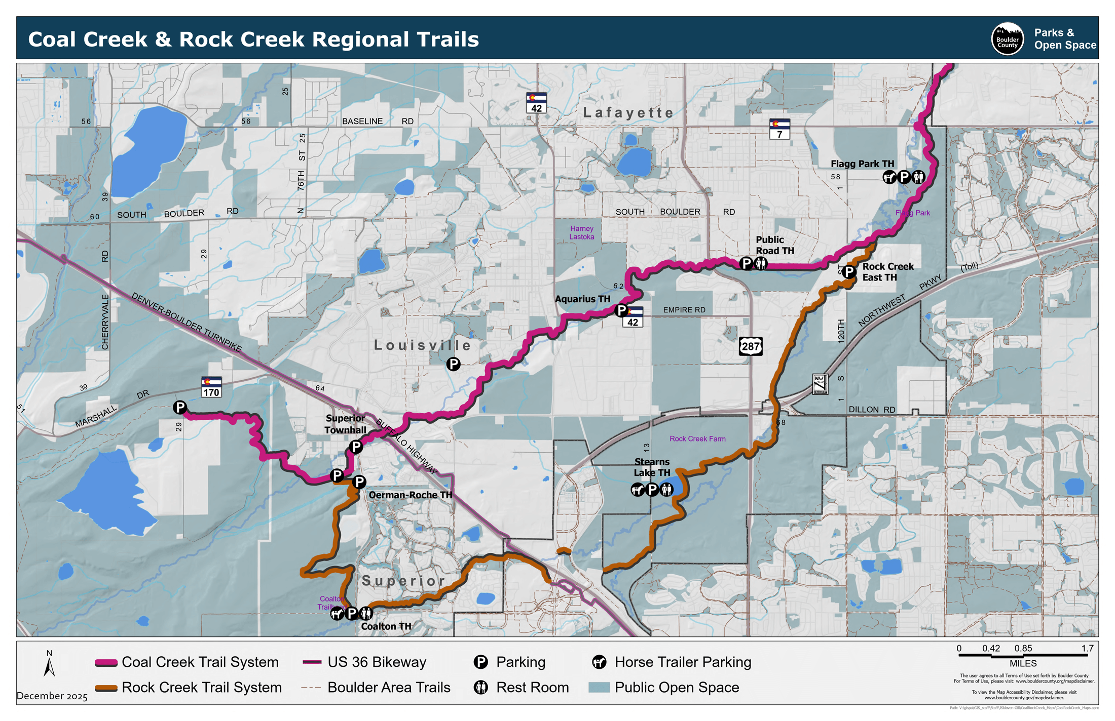 The Coal Creek Regional Trail is a 14-mile of soft-surface trail that parallels Coal Creek, from South 66th Street in Superior through Louisville and Lafayette to Vista Parkway in Erie. For locals, the trail offers access to nature just steps from home while it also provides a corridor for wildlife.