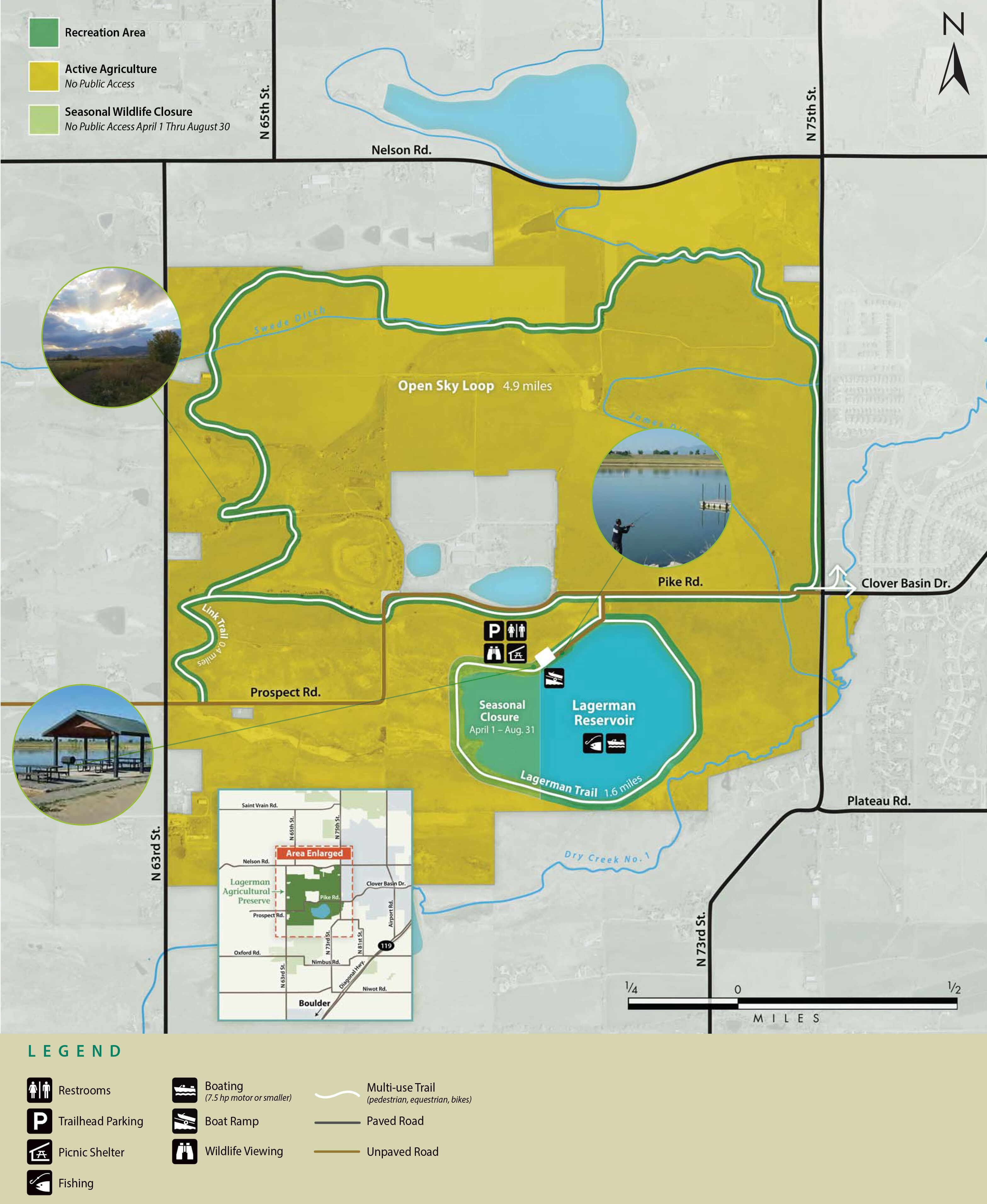 - From April 1 – Aug. 31, the western end of the reservoir is closed for nesting birds.