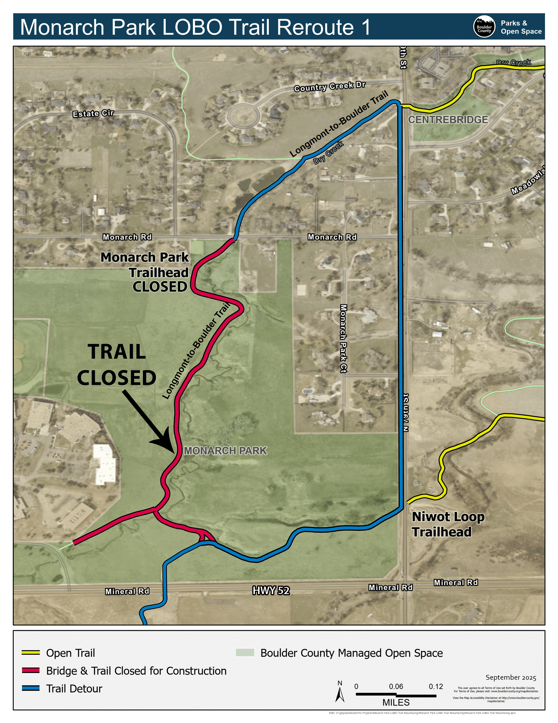 A section of the trail is closed between Monarch Road and Highway 52 (Mineral Road) for resurfacing. Please use the detour along N. 79th Street. LoBo Closure Map