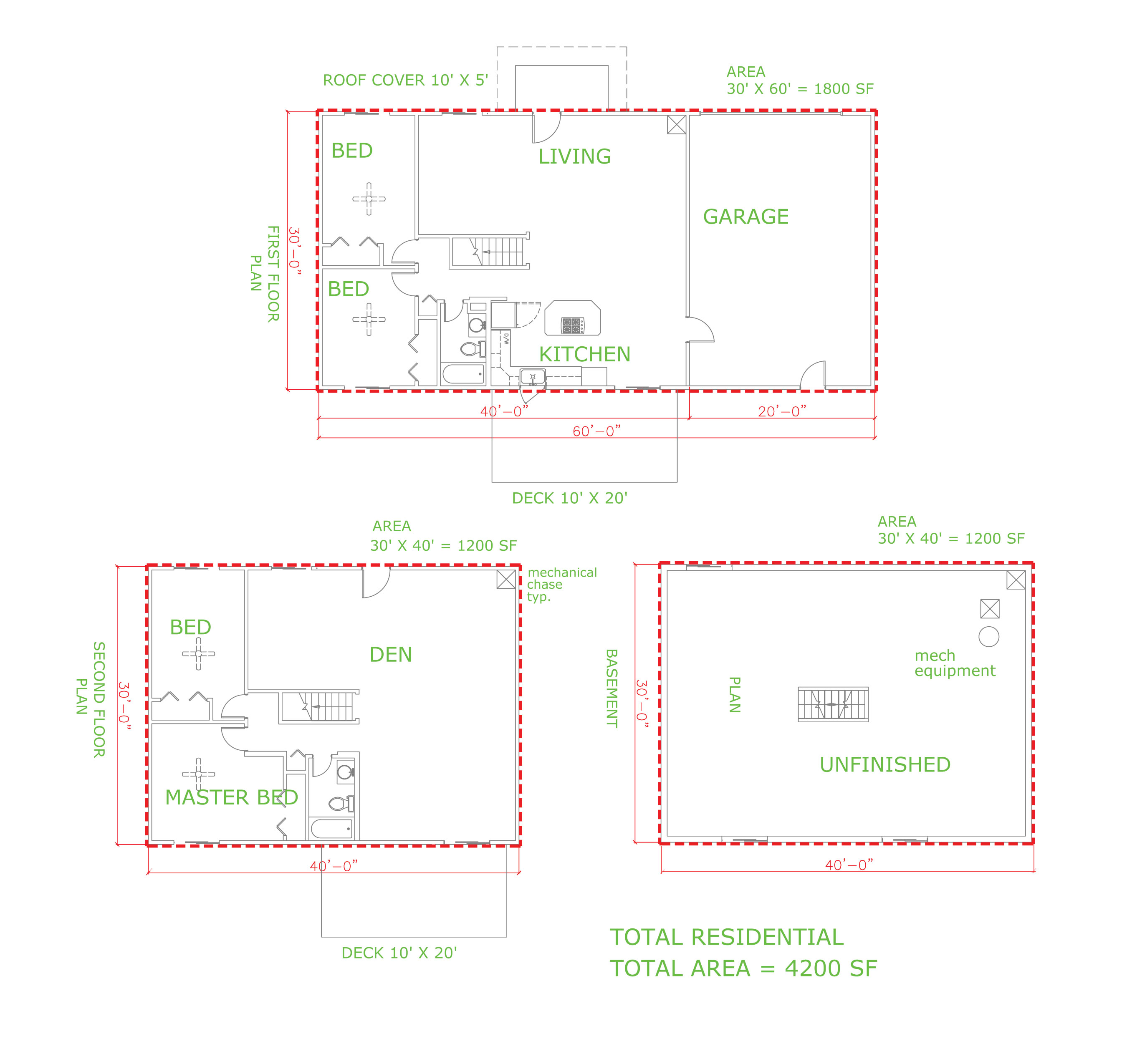Floor Area is measured in terms of square feet. The total square footage is everything within the exterior face of the exterior walls including garages and basements. See Figure 1: Floor Plan Examples below.