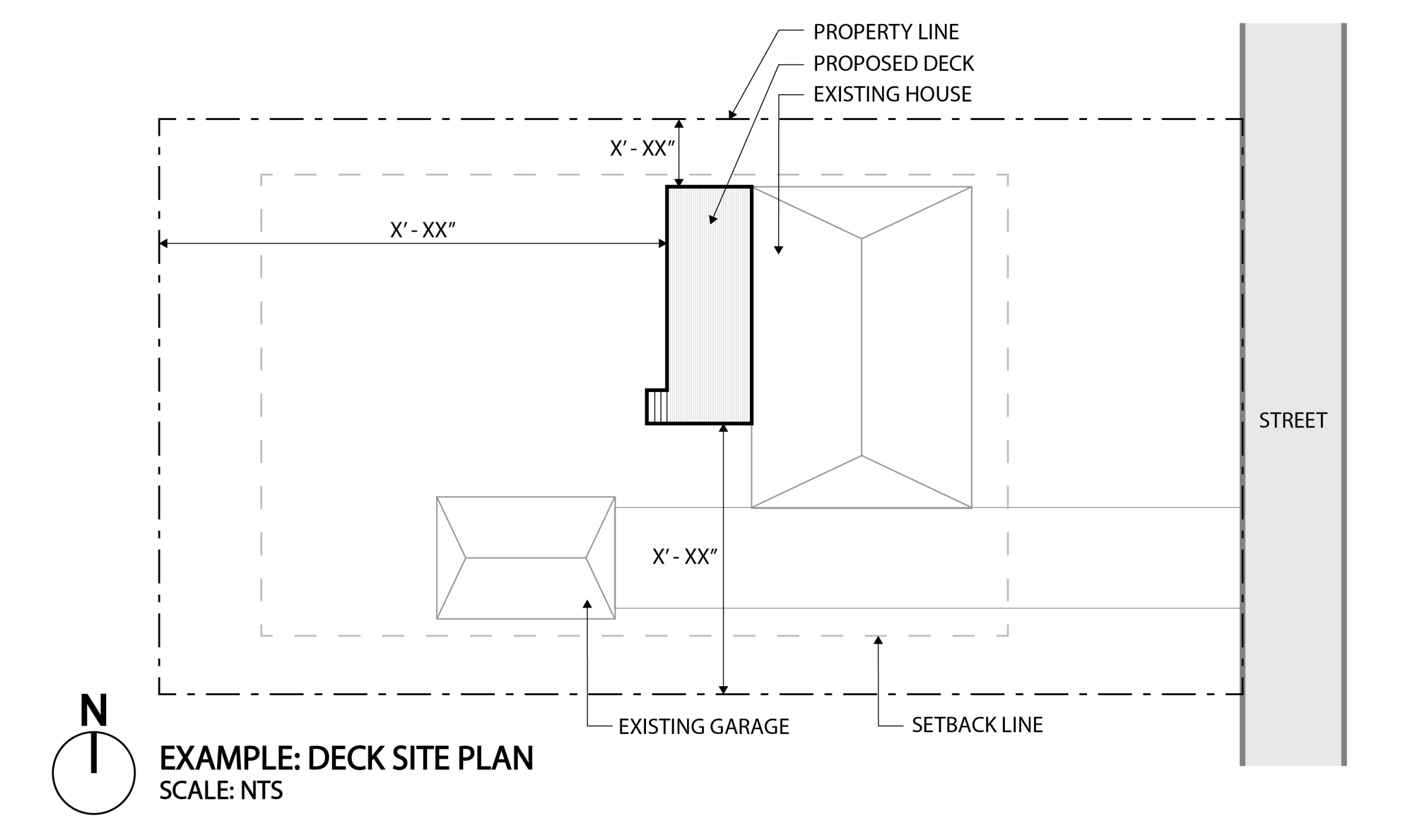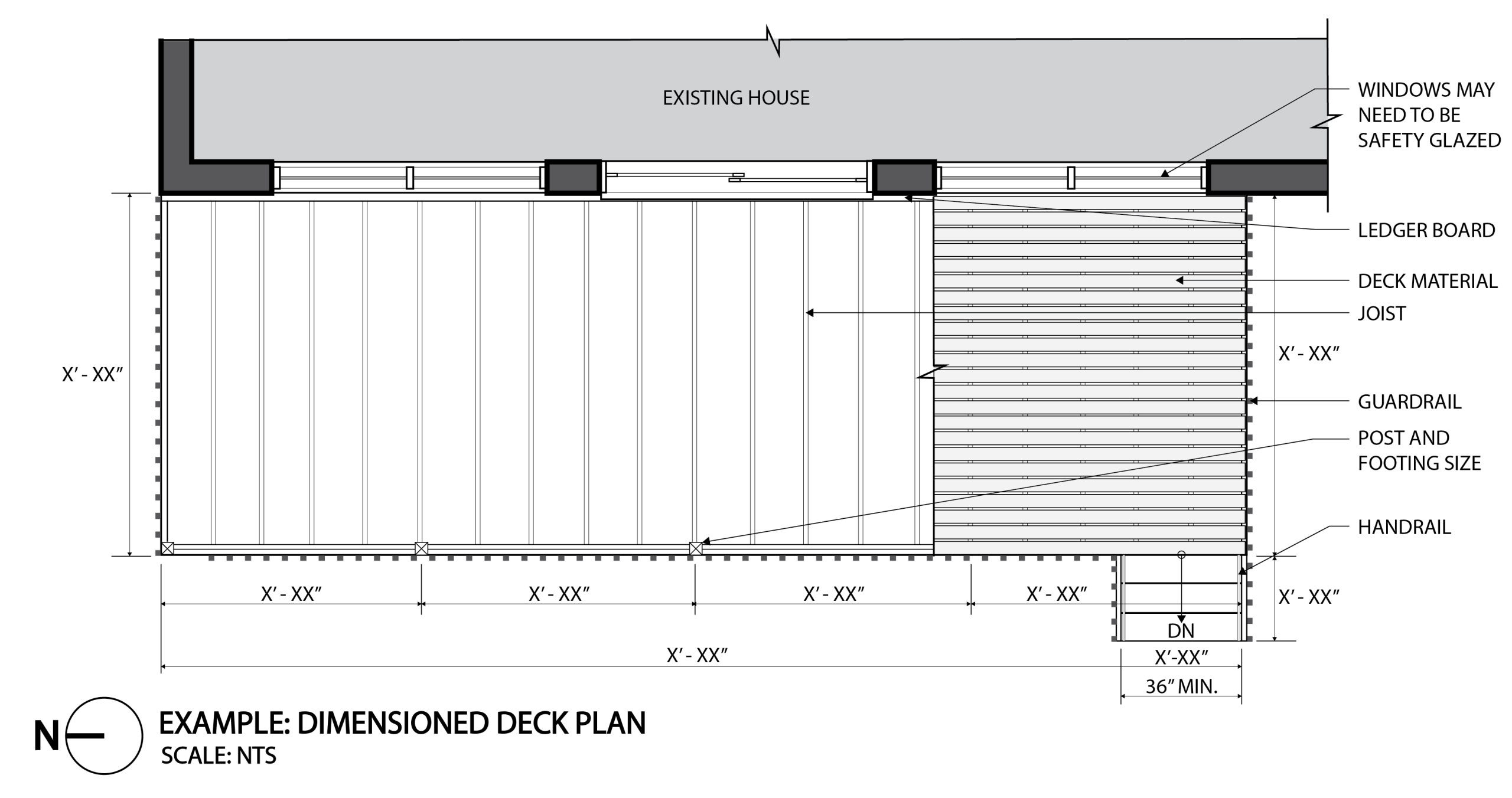 - Proposed deck size with dimensions to scale with minimum 1/4 inch scale per square foot