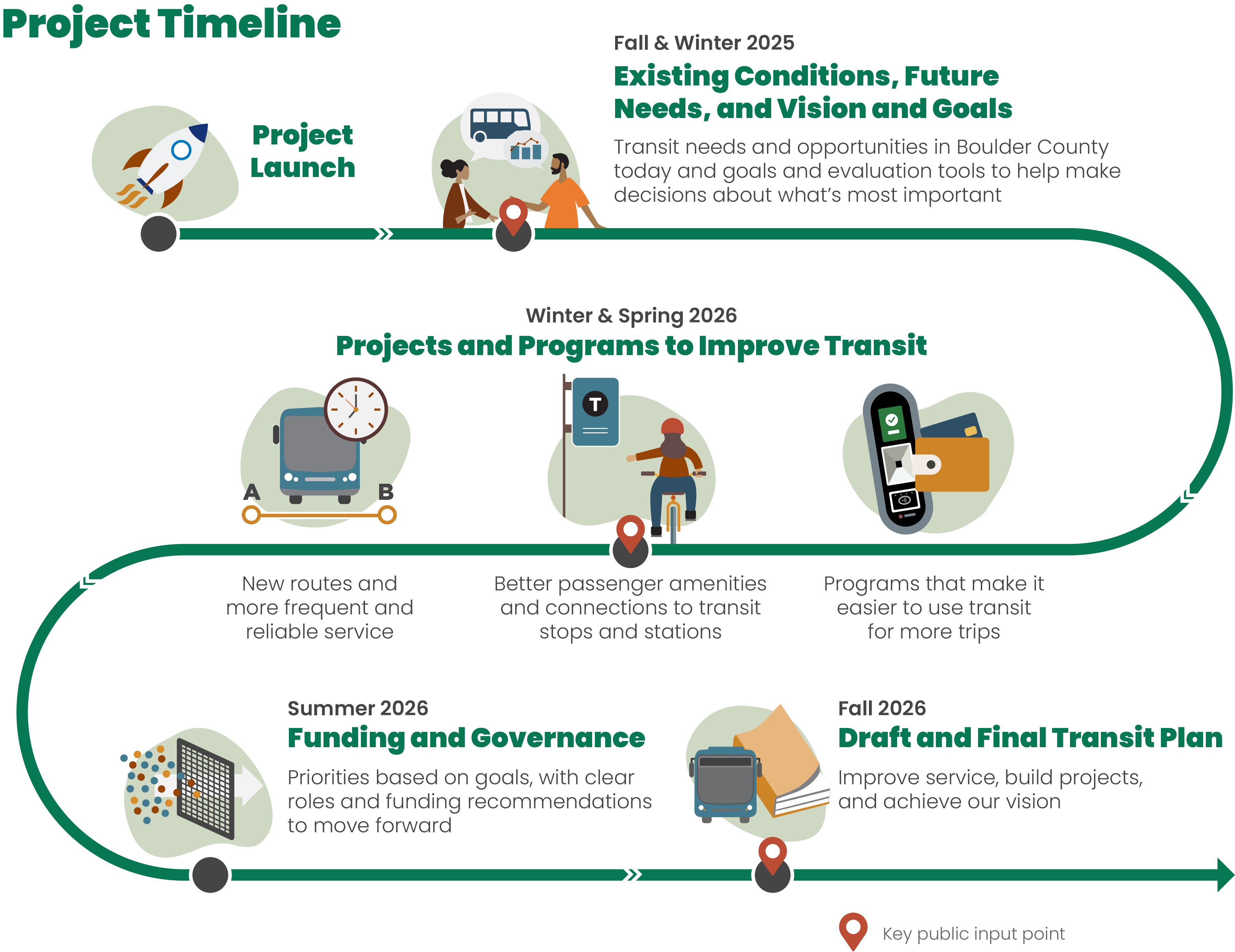 Linking Boulder County began in summer 2025 and will wrap up by the end of 2026. The graphic below shows our schedule and is followed by a description of the key activities.