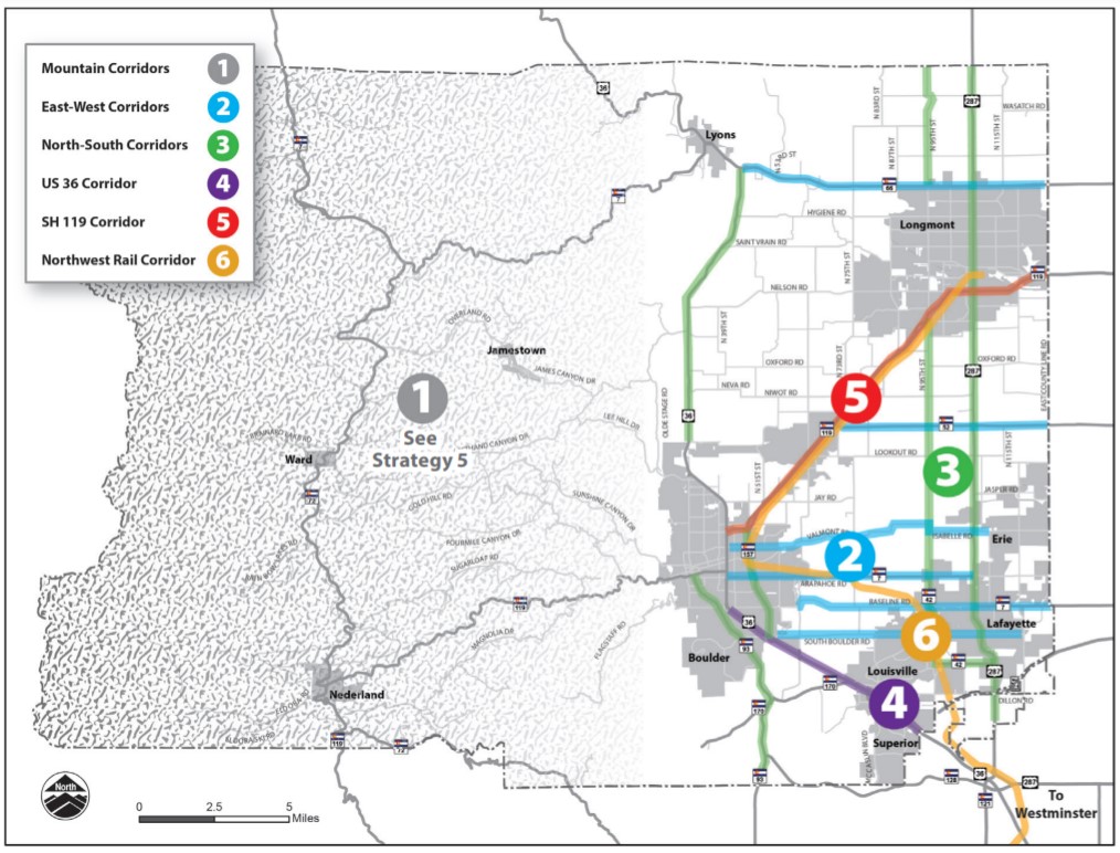 Boulder County travel corridors include local and regional routes that form an integrated transportation system. Boulder County considers each travel corridor as a geographic area encompassing all available and future modes. These regional multimodal corridors are essential to mobility throughout the county and region.